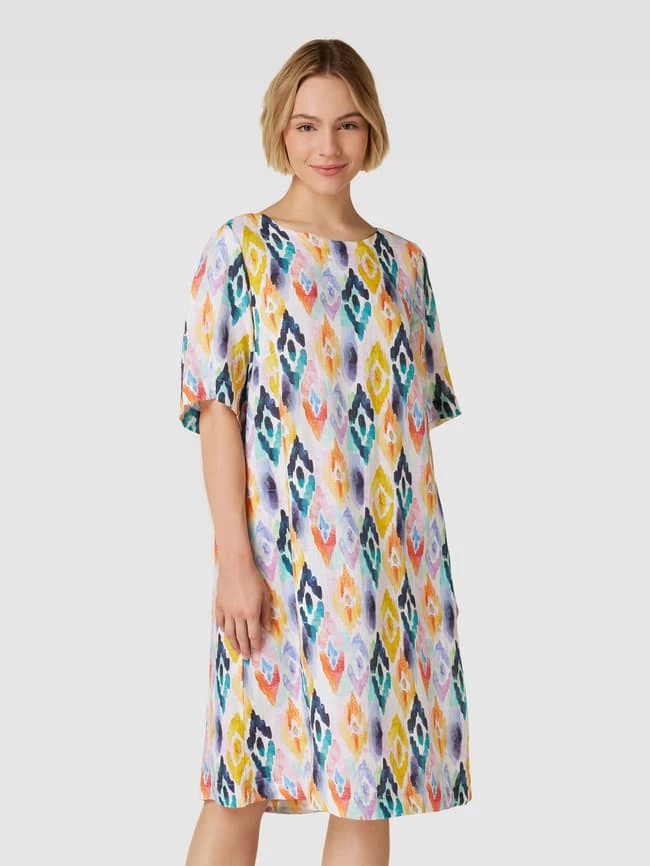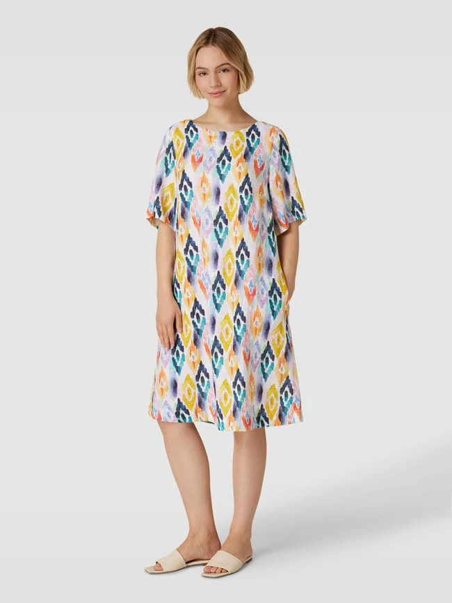 Knielanges Kleid Aus Leinen Mit Allover-Print In Weiß
